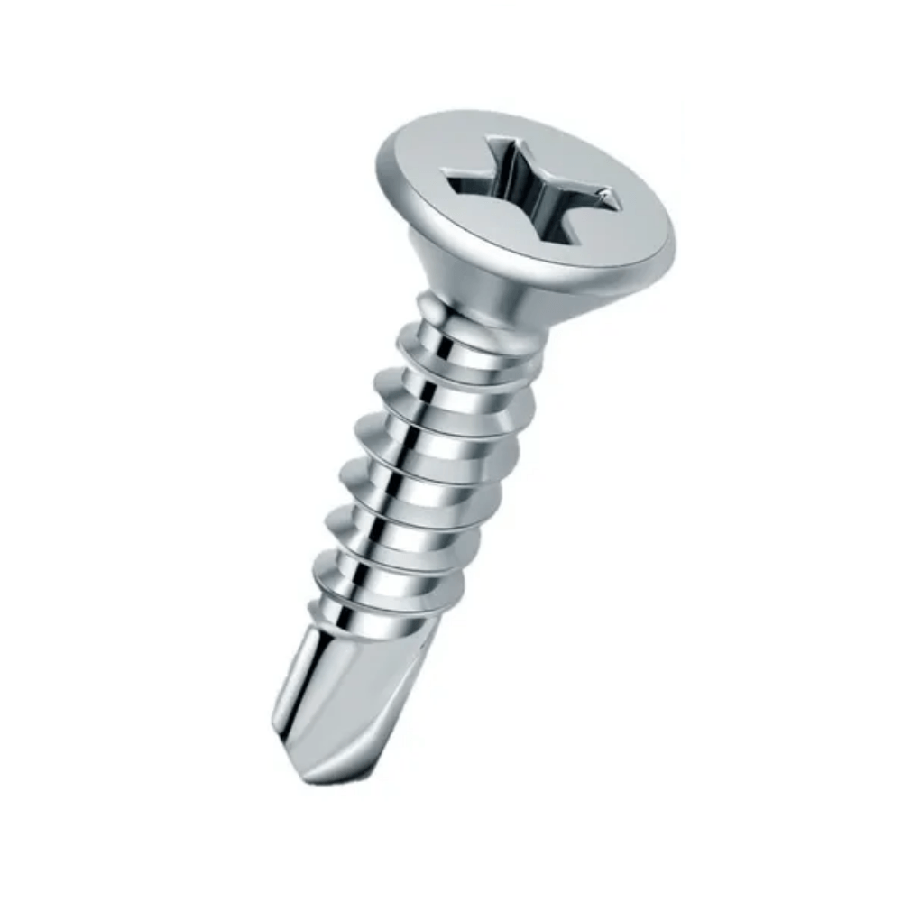 Parafuso autoperfurante com cabeça chata/escareada e acionamento Phillips. Desenvolvido para aplicações que exigem um acabamento plano e sem ressaltos, permitindo que a cabeça do parafuso fique nivelada com a superfície. Requer um furo escareado para um encaixe perfeito.